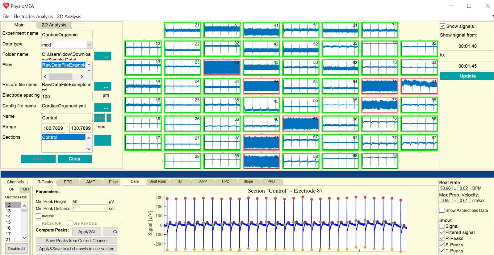 9. The calculated beat rate of each channel for each section, according to the calculated inter-beat intervals (and detected R-peaks), is presented under “Beat Rate” (in beat per minute, BPM) including its standard deviation. For more than one channel analyzed, the maximal propagation velocity per beat spreading through the electrode array of the MEA plate and calculated according to the maximal propagation period, is presented under “Max Prop. Velocity” (in centimeters to seconds, cm/sec), including its standard deviation.
