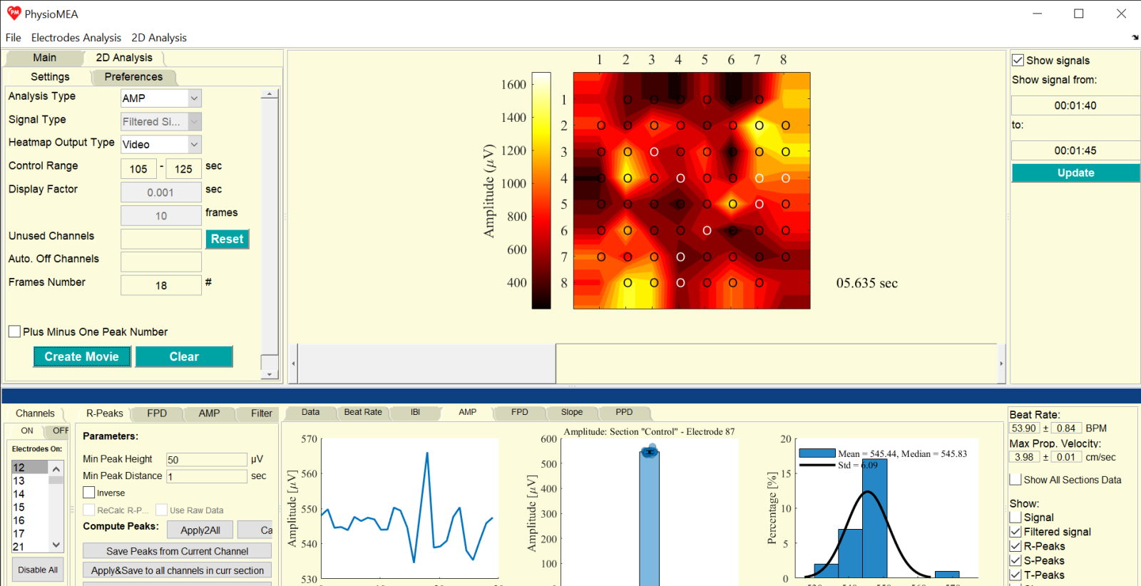 2. On “2D Analysis” tab, choose the analysis type from the list next to “Analysis Type”. For “Potential”, choose raw or filtered signal from the list next to “Signal Type”. For other analysis types, the 2D data is based on a calculated data (“Signal Propagation”) or saved biomarkers (“FPD”, “AMP”, “Slope”, and “PPD”), thus, signal type list is disabled.