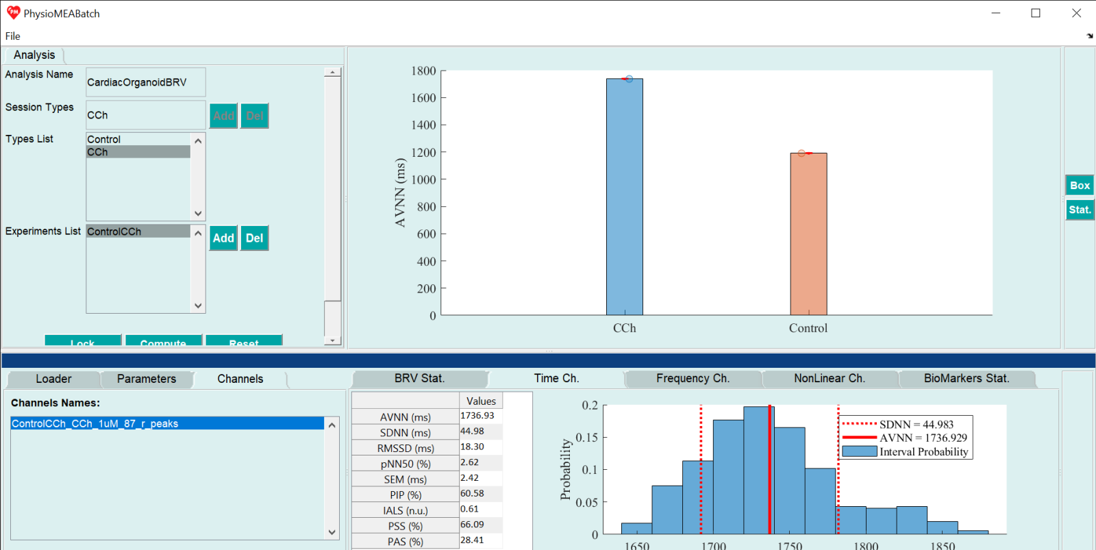 6. BRV analysis is performed by PhysioZoo toolbox based on calculated R-peaks analyzed by PhysioMEA and by using BRV parameters of the default loaded configuration file presented on “Parameters” tab. Press the button next to “Config file name” to load different configuration file. Default BRV analysis in performed by analyzing full R-peak time series data derived from each channel, as the “Full Signal Length” button is chosen. Choose “Window Length” option to define different window length to divide each R-peak time series data into, by inserting the desired time length on the appeared textbox as hh:mm:ss.